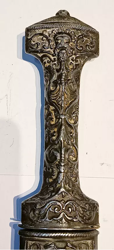 Impugnatura e fodero in bronzo argentato interamente decorati con volti, chimere, draghi e cartigli.